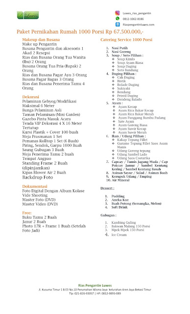 Rias Pengantin Luwes menyediakan jasa paket catering pernikahan lengkap dengan rias pengantin, dekorasi pelaminan, dan tenda VIP. Terdapat beberapa pilihan paket catering pernikahan yang mungkin sesuai untuk kebutuhan resepsi pernikahan anda. Berikut beberapa paket pernikahan yang sudah lengkap dengan catering pernikahan.